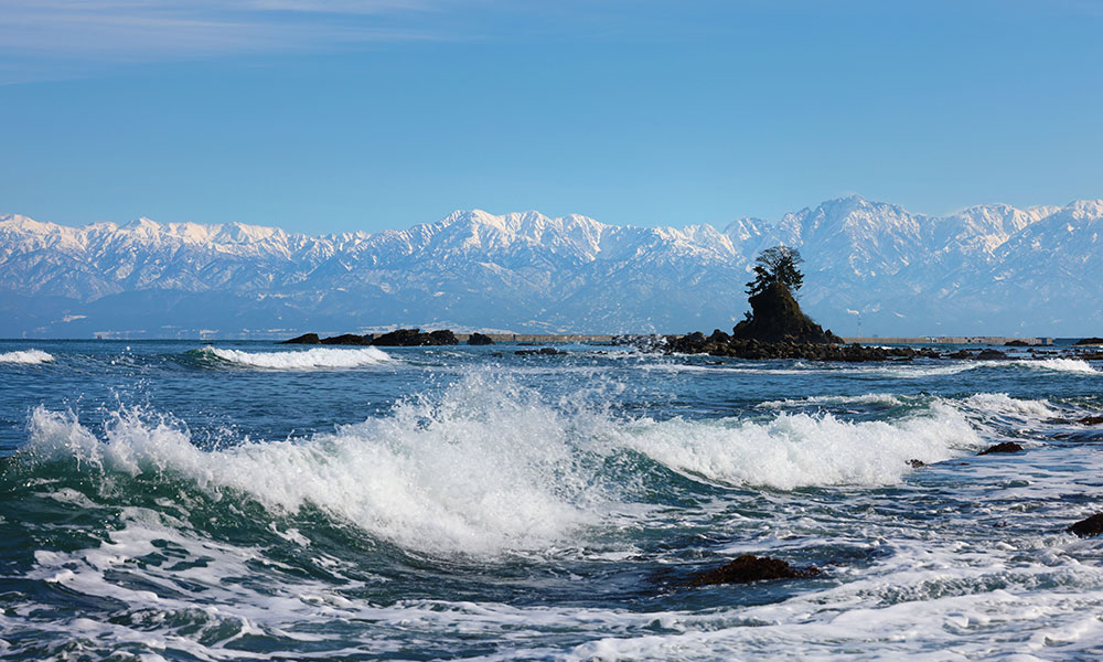 富山湾の向こうに立山連峰を望む絶景スポット。浜から眺める「女岩」と、3,000m級の山々が織りなす景観は詩情あふれる風景です。大伴家持もこの地を愛し、多くの歌を残しました。道の駅雨晴(あまはらし)ではカフェでのんびりと景色を楽しめます。